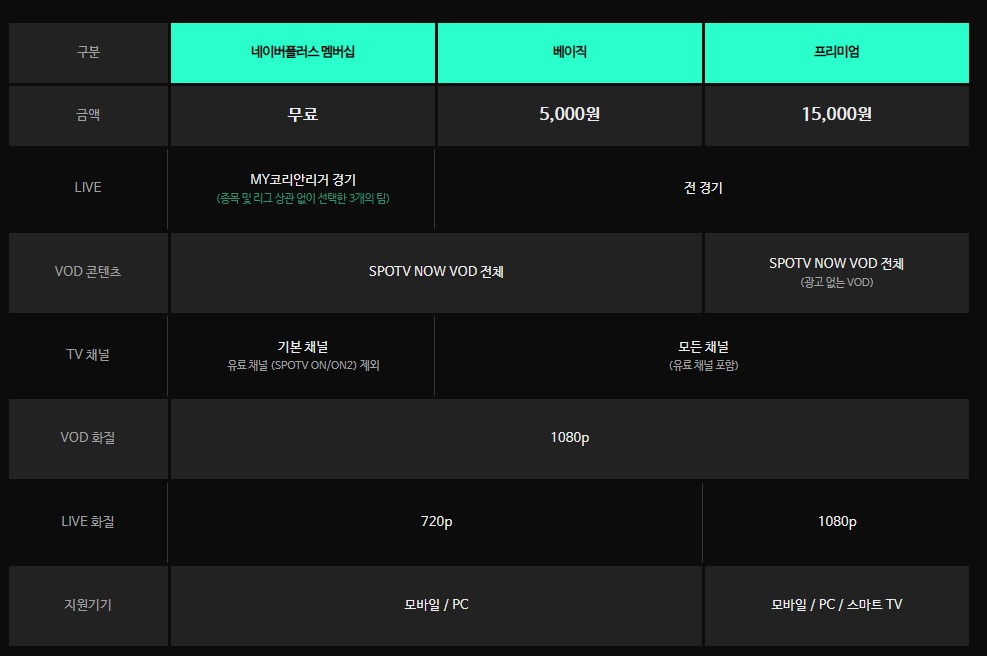 | 주의사항 | 베이직 이용권은 우리나라 선수들이 소속된 경기만 시청할 수 있습니다. 프리이엄 요금제는 무제한으로 감상이 가능합니다. |