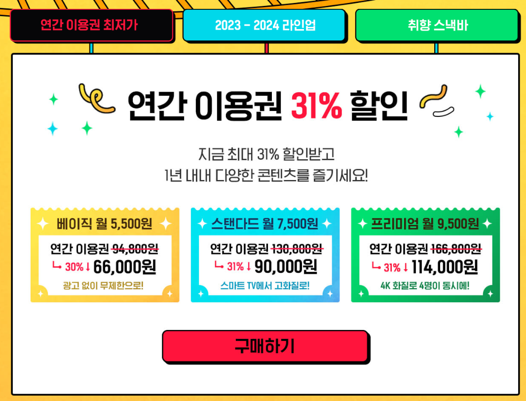 신규 가입자는 23년 12월 1일부터 인상된 가격인 베이직 9,500원, 스탠다드는 13,500원, 프리미엄 17,000원에 서비스 이용이 가능합니다.