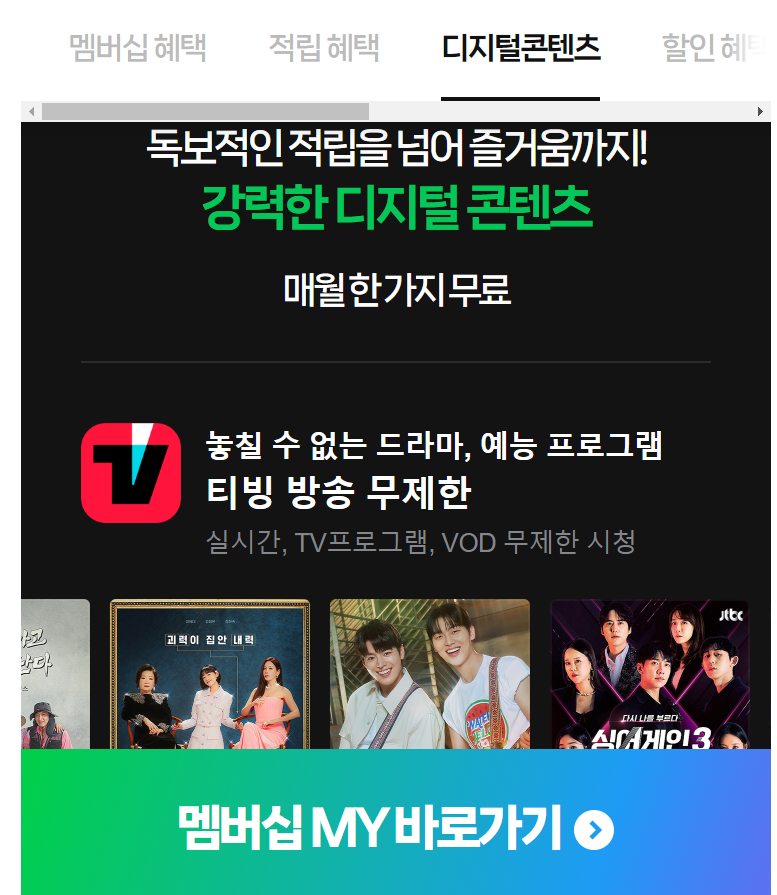 네이버 플러스 멤버쉽 가입자 이면 디지털 컨텐스 무제한 즐기기의 혜택으로 티빙을 한 달간 무료로 시청할 수 있습니다. 네이버 플러스 멤버쉽은 월 4,900원의 저렴한 가입비용으로 쇼핑할 때 최대 5%의 적립과 다양한 ott채널를 무료로 즐길 수 있거나 네이버 웹툰을 볼 수 있는 쿠기 49개, 스포티비 나우, 시리즈 온 영화, 바이브 음악 중에 선택하여 무제한으로 이용할 수 있는 서비스를 제공하고 있습니다.